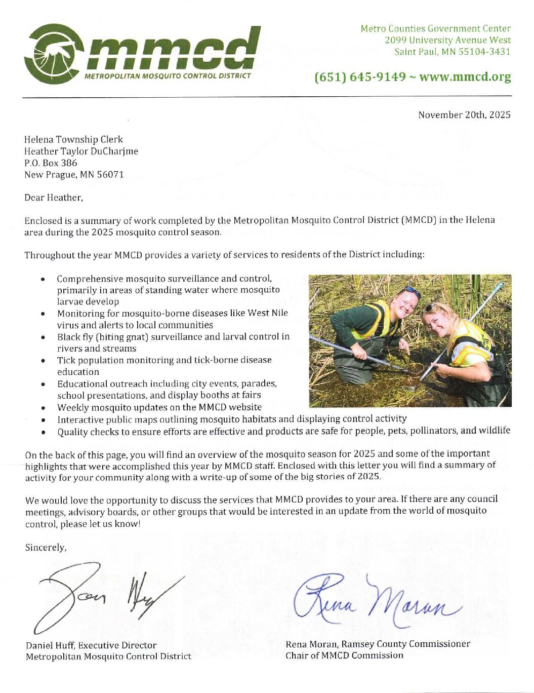 On the back of this page, you will find an overview of the mosquito season for 2025 and some of the important highlights that were accomplished this year by MMCD staff. Enclosed with this letter you will find a summary of activity for your community along with a write-up of some of the big stories of 2025.
