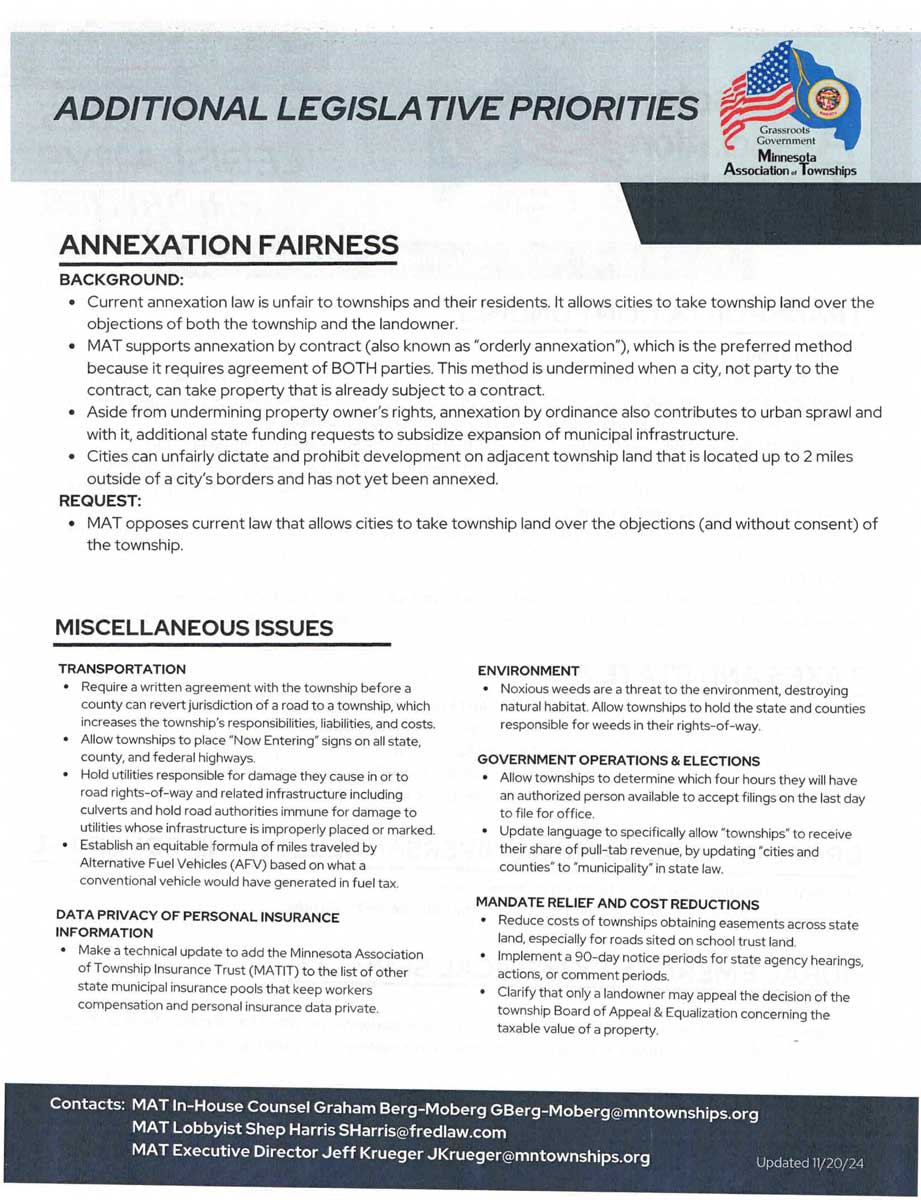 A significant portion of the discussion revolved around tax policies and how state aid is distributed to townships. MAT is advocating for reforms to Local Government Aid (LGA) and township property tax policies to better support small rural communities. We joined the conversation by emphasizing how important it is for the state to continue investing in townships like ours so we can provide essential services without placing too heavy a burden on local taxpayers.